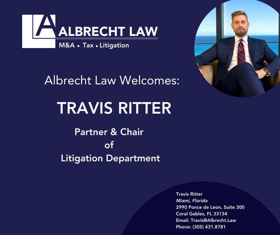 I am incredibly excited to welcome Travis Ritter to Albrecht Law to launch our Litigation Department. Travis is a brilliant litigator and the person our clients want in their corner for their disputes. Travis worked for two leading commercial and trial law firms, clerked for federal appellate and trial court judges, and founded a PE firm.